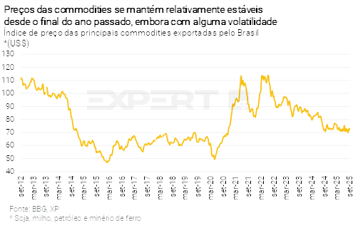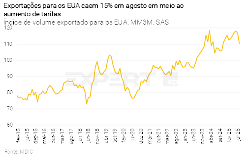 Os efeitos das tarifas de 50% impostas pelos Estados Unidos começam a ser observados na balança comercial brasileira. Em agosto, o volume exportado para os Estados Unidos recuou 15,4% ante julho. Segmentos mais dependentes do mercado americano e que não foram isentos, como móveis, apresentaram forte queda nas exportações totais. Já as vendas de bens de setores como aviação, siderurgia e celulose também recuaram, embora não tenham sido diretamente afetados pelas tarifas de 50%. Segundo o MDIC, parte desse movimento se deve à antecipação de embarques em julho. Nossa projeção incorpora efeito negativo de US$ 2,0 bilhões neste ano. Mantemos a estimativa de superávit comercial de US$ 60,6 bilhões em 2025 e de US$ 62,0 bilhões em 2026, abaixo dos US$ 74,3 bilhões de 2024 (metodologia MDIC).