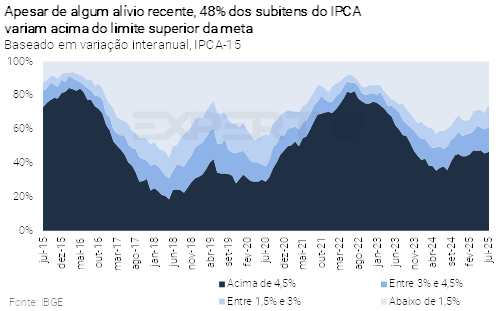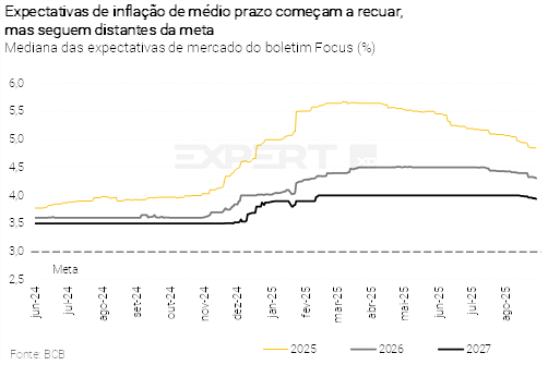 Inflação corrente melhorou, mas segue distante da meta. As leituras recentes do IPCA mostraram deflação de alimentação e certa estabilidade no grupo de bens industrializados. O enfraquecimento do dólar, safras de alimentos robustas e clima favorável para itens in natura explicam tal movimento. No curto prazo, esperamos que a dinâmica continue benigna para esses grupos. Por outro lado, a inflação de serviços – especialmente aqueles mais intensivos em mão de obra – voltou a subir em agosto, refletindo o cenário de superaquecimento no mercado de trabalho e expectativas (ainda) desancoradas. Tudo considerado, o IPCA segue rodando distante da meta de 3,0%, apesar de alguma descompressão nos últimos meses.