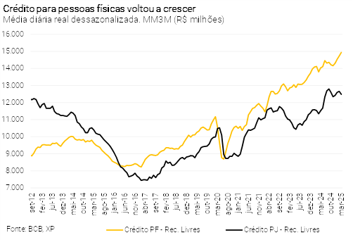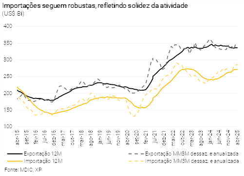 Sem alívio em serviços. Os indicadores de mercado de trabalho seguem com desempenho surpreendente, com dados do primeiro trimestre mostrando solidez na geração de empregos formais e na evolução dos salários. Além disso, as concessões de crédito ao consumidor contrariaram as taxas de juros restritivas e mostraram avanços nos últimos dados, fator que deverá sustentar a atividade no curto prazo. Desta forma, nossa visão altista para a inflação de serviços segue em voga. Projetamos 6,5% para o grupo em 2025.