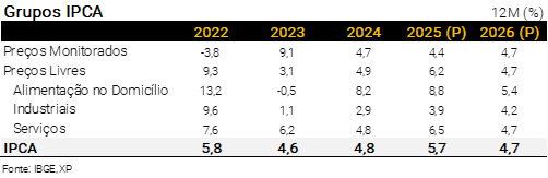 Tudo considerado, o recuo em nossa projeção de bens industrializados e administrados, reduzimos nossa projeção para o IPCA 2025 de 6,0% para 5,7%.