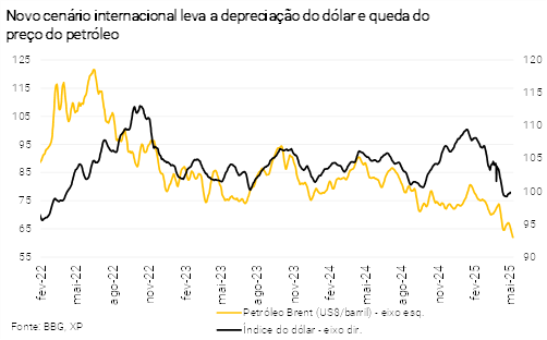 - A incerteza global aumentou significativamente após o “Liberation Day” nos EUA. Bancos Centrais estão mais cautelosos. Contudo, duas tendências se consolidaram, dólar americano mais fraco globalmente e preços do petróleo mais baixos. São vetores conflitantes para o Brasil.