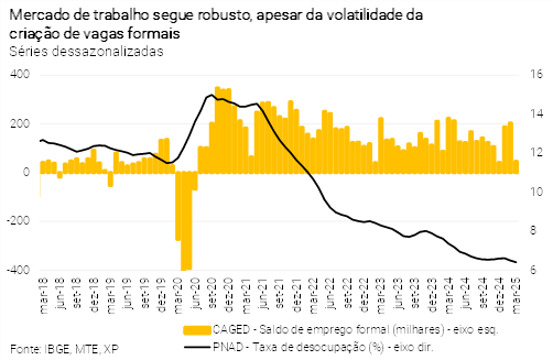 Taxa de desemprego permanece baixa, enquanto renda do trabalho aumenta de forma contínua. Conforme observado na PNAD, a taxa de desemprego vem oscilando ao redor de 6,5% desde outubro do ano passado (dados mensais e dessazonalizados), o menor patamar da série oficial iniciada em 2012. A forte expansão da massa de renda real também reflete o mercado de trabalho aquecido no Brasil – o indicador mostrou alta de 7,5% no acumulado em doze meses até março. Por sua vez, o saldo de emprego formal do CAGED trouxe sinais mistos recentemente, com desempenho muito acima do esperado em fevereiro e frustração no mês seguinte, dado o impacto do feriado móvel de Carnaval. Isto posto, a criação líquida de ocupações com carteira assinada continuou em níveis elevados: cerca de 460 mil no 1º trimestre de 2025, não muito abaixo do total de 535 mil no 1º trimestre de 2024 (com ajuste sazonal).
