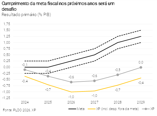 Projeto de lei de diretrizes orçamentárias mostra arcabouço fiscal insustentável. Como esperado, o governo manteve a meta de 2026, mas destacou a necessidade de um aumento de receitas da ordem de R$ 118 bilhões – o que só deve ser discutido na lei orçamentária anual. No entanto, o que chamou a atenção foram as estimativas oficiais para a receita líquida e, principalmente, para as despesas discricionárias dos próximos anos. No primeiro caso, vemos uma redução da receita líquida da de 18,8% do PIB em 2026 para 18,1% em 2029, mostrando que boa parte do ajuste realizado nos últimos anos do lado da receita se baseou em medidas não estruturais (extraordinárias).