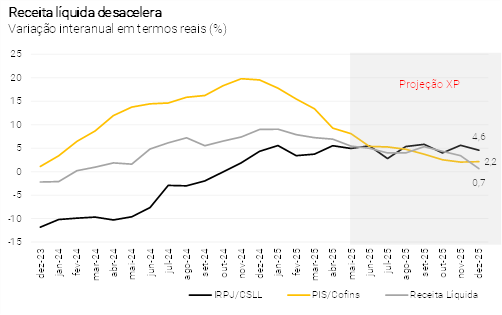 Meta (ainda) mais difícil em 2026. Além da inflação mais baixa e da atividade em desaceleração, a queda dos preços do petróleo também contribui para um crescimento mais moderado da receita líquida. Projetamos déficit de R$ 137,2 bilhões (1,0% do PIB), ou R$ 82,1 bilhões (0,6% do PIB) excluindo-se as despesas com precatórios para efeito do cumprimento da meta. Como a meta do próximo ano corresponde a um superavit de R$ 31,8 bilhões (0,25% do PIB), seriam necessários R$ 113,9 bilhões em receitas adicionais.