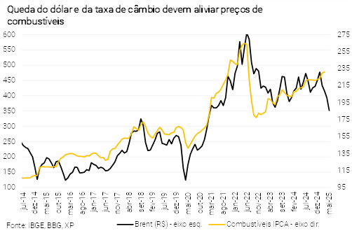 Taxa de câmbio e petróleo devem limitar inflação de bens industrializados. A depreciação cambial do ano passado ainda deve ter efeito sobre preços de bens industrializados no segundo trimestre. Contudo, os atuais níveis do petróleo e a apreciação cambial recente, incorporada em nosso cenário, devem aliviar em parte essa pressão. Assim, reduzimos nossa projeção para a inflação de bens industriais em 2025, de 4,5% para 3,9%.
