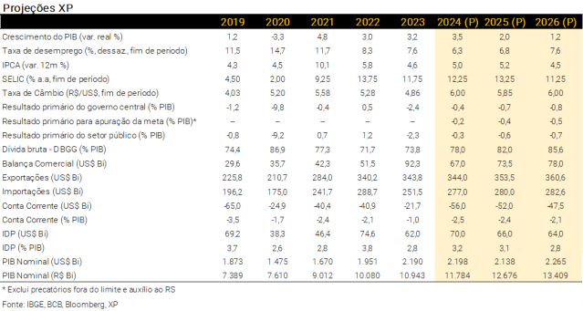 - No Brasil, a atividade continua aquecida, com desempenho sólido do consumo e do investimento. Esperamos desaceleração gradual adiante, refletindo o aperto da política monetária e o menor impulso fiscal. Projetamos que o PIB crescerá 3,5% em 2024, 2,0% em 2025 e 1,2% em 2026.