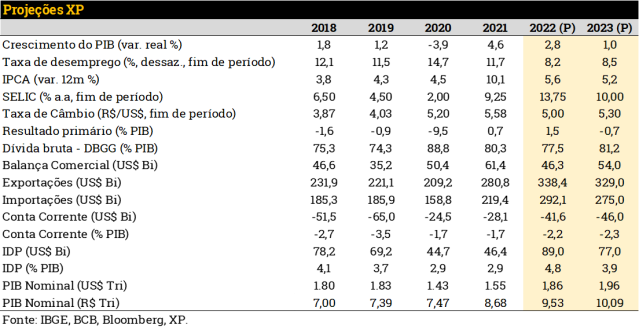 - Com a hipótese de adoção de uma nova âncora fiscal crível no Brasil, mantemos o cenário de que a taxa Selic ficará em 13,75% até junho e cairá para 10,00% até o final de 2023.