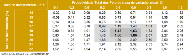 Nossas simulações indicam aumento do PIB potencial do Brasil. Com a ampliação das discussões sobre a agenda de reformas estruturantes – considerando tanto as medidas aprovadas nos últimos anos quanto as perspectivas para o próximo mandato presidencial –, a temática de capacidade de crescimento econômico a longo prazo vem ganhando espaço. Dessa forma, realizamos simulações com diferentes cenários para taxa de investimento, produtividade e mercado de trabalho, e chegamos a estimativas de expansão anual do PIB potencial entre 1,4% e 1,9% (adotamos 1,8% em nosso cenário base). Os cálculos e análises completas podem ser encontrados no relatório XP Macro Especial: Discussões sobre recuperação cíclica e crescimento econômico estrutural.