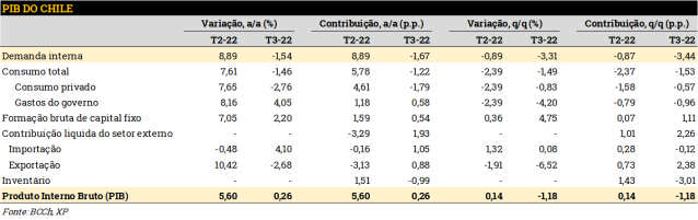 O PIB do Chile contraiu em 1,2% no terceiro trimestre de 2022 (em comparação ao trimestre imediatamente anterior, após ajuste sazonal), marcando o início de um período recessivo. Ao considerar a evolução do PIB ao longo do ano, a atividade econômica se encontra 1,7% abaixo do pico observado no quarto trimestre de 2021. A contração foi impulsionada principalmente pela queda notável em consumo privado e gastos do governo (-0,83% e -4,20%, respectivamente). Ao todo, a contração no consumo total (público e privado) teve uma contribuição negativa de 1,53%. Ademais, a variação de estoques também teve uma forte contribuição negativa no trimestre (-3,01pp). Por outro lado, a expansão do setor externo (exportação menos importação) e da formação bruta de capital fixo suavizaram a queda. Ao todo, o PIB do Chile registrou a maior queda dos últimos dois anos.