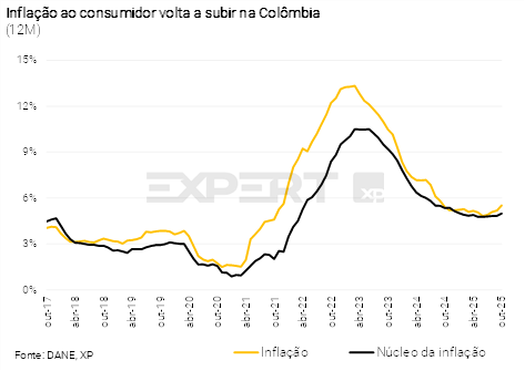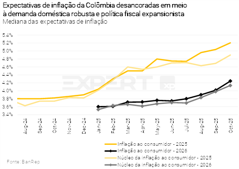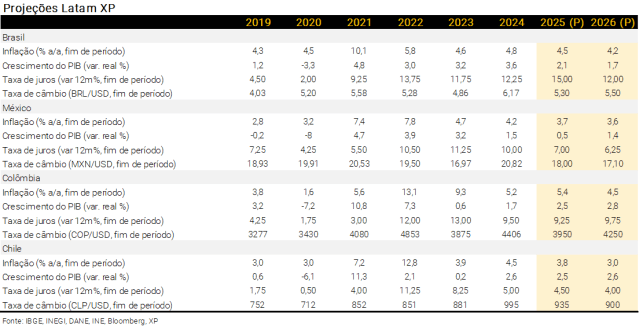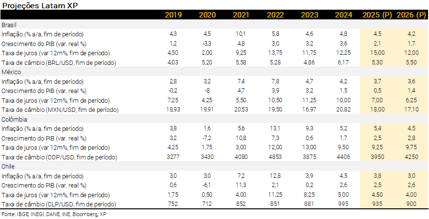 - Na Colômbia, o banco central manteve a taxa de juros em 9,25% em sua última reunião. No entanto, esperamos um ciclo de aperto monetário adiante. A inflação corrente e as expectativas estão em alta e a demanda doméstica segue robusta, puxada pela expansão fiscal. Ademais, projetamos aumento entre 10% e 12% no salário-mínimo em 2026. Portanto, projetamos a taxa básica de juros em 9,25% ao final deste ano e 9,75% ao final do ano que vem.