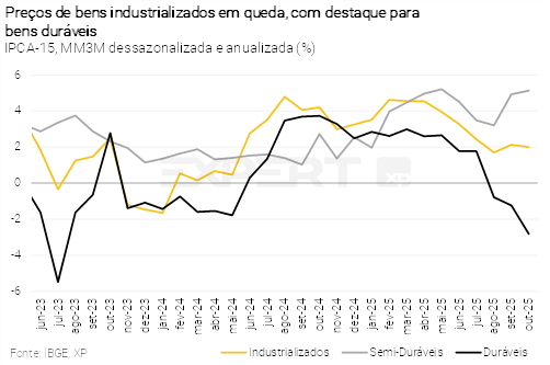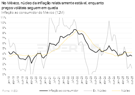 - No México, a inflação ao consumidor recuou em outubro, refletindo a queda em preços mais voláteis, enquanto o componente subjacente resiste ao processo desinflacionário. Esperamos que o banco central local realize novo corte na taxa básica de juros na reunião de dezembro, para 7,00%. Para o ano que vem, prevemos uma pausa temporária no ciclo a partir do 1º trimestre. O processo de desinflação segue frágil, há riscos altistas nos preços advindos de novos impostos, e incertezas sobre a trajetória do Fed devem influenciar nas decisões sobre a política monetária mexicana.