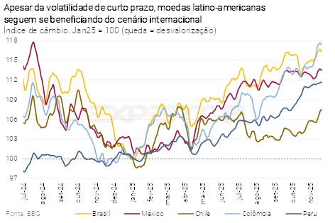 O Fed pode frustrar a expectativa dos mercados. Os indicadores de atividade nos Estados Unidos não sinalizam uma desaceleração contundente, e a inflação continua acima da meta. O shutdown dificultou essa leitura, devido à ausência de dados econômicos relevantes. Assim, o Fed pode desapontar as apostas mais otimistas sobre a continuidade da redução dos juros, como sugeriu o presidente do Fed, Jerome Powell, na última coletiva após a decisão de política monetária. Isso poderia implicar alguma valorização do dólar, pressionando moedas emergentes.