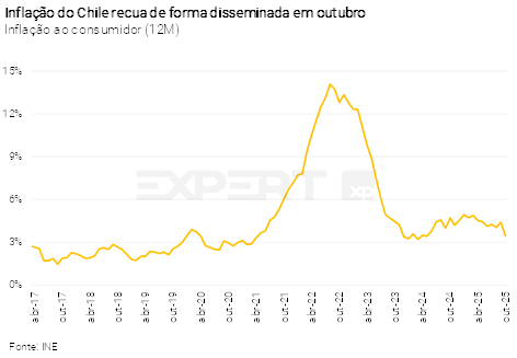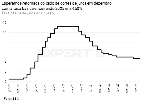 A inflação ao consumidor de outubro deve aliviar as preocupações recentes da autoridade monetária sobre o processo de desinflação. Além disso, as expectativas de mercado para os próximos dois anos seguem ancoradas na meta de 3%. O cenário descrito acima corrobora a continuidade do ciclo de flexibilização monetária pelo BCCh. Mantemos nossa projeção de corte de 0,25 p.p. na taxa de juros básica em dezembro, levando-a para 4,50%. Para o final do ano que vem, projetamos 4,00%.