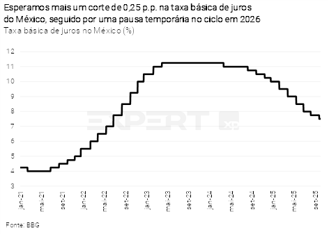 Em sua última reunião de política monetária (novembro), o Banxico reduziu sua taxa básica de juros em 0,25 p.p. para 7,25%, conforme esperado. A decisão foi dividida, com um dos cinco diretores optando pela manutenção dos juros. Adiante, a autoridade sinalizou postura mais cautelosa, indicando possível intenção de pausar o atual ciclo de flexibilização monetária a partir do ano que vem. O processo de desinflação segue frágil, há riscos altistas advindos de novos impostos e incertezas sobre a trajetória do Fed devem influenciar nas decisões daqui para frente. Esperamos mais um corte de 0,25 p.p. em dezembro, levando o juro básico para 7,00% ao final deste ano. Para 2026, esperamos uma pausa temporária no ciclo de cortes a partir de fevereiro, com a taxa básica encerrando o ano em 6,25%.