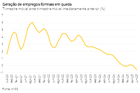Na atividade econômica, os investimentos recuaram 1,7% entre março e abril, com queda expressiva na construção residencial e em máquinas e equipamentos. A piora nas expectativas devido à nova configuração do sistema judicial do México e ao cenário tarifário incerto pode levar a uma queda adicional no investimento adiante. Paralelamente, a geração de empregos formais encolheu 0,6% no trimestre móvel até junho ante o trimestre móvel até abril. Trata-se do pior desempenho da criação de empregos formais desde 2020.