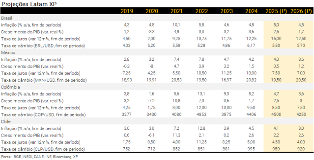- No México, o núcleo da inflação registrou alta pelo 2º mês consecutivo. A economia não mostra sinais de recessão, mas de estagnação. Nesse contexto, o banco central interrompeu o ciclo de cortes de juros na última reunião e sinalizou abordagem mais dependente dos dados. Enquanto isso, persiste a incerteza em relação a um novo acordo comercial com os Estados Unidos. Projetamos a taxa de juros de referência em 7,50% ao final deste ano.