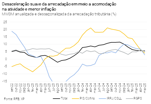 Com relação às contas públicas, o resultado primário atingiu R$ 32,2 bilhões entre janeiro e maio, o melhor resultado desde 2022 – mas esconde um represamento do lado da despesa, que será corrigido no segundo semestre, devolvendo o saldo para o campo negativo. Acreditamos que será possível atingir o limite inferior da meta de resultado primário em 2025. Nossa avaliação é baseada em três fatores: i) a arrecadação tributária desacelerou, mas continua em nível elevado; ii) receitas extraordinárias adicionais, como dividendos de empresas estatais e leilões de campos de petróleo, podem ser utilizadas; e iii) execução mais fraca de despesas, principalmente com pessoal, encargos sociais e discricionárias.