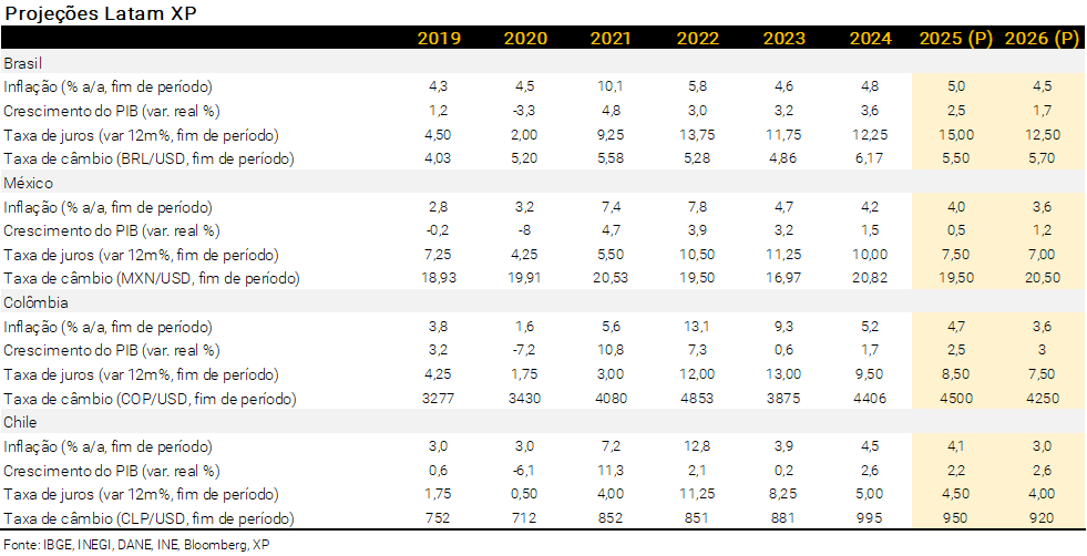 • No México, o núcleo da inflação registrou alta pelo 2º mês consecutivo. A economia não mostra sinais de recessão, mas de estagnação. Nesse contexto, o banco central interrompeu o ciclo de cortes de juros na última reunião e sinalizou abordagem mais dependente dos dados. Enquanto isso, persiste a incerteza em relação a um novo acordo comercial com os Estados Unidos. Projetamos a taxa de juros de referência em 7,50% ao final deste ano.