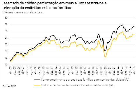 Domesticamente, o mercado de trabalho segue aquecido, em meio a sinais de desaceleração gradual na produção e no consumo. A taxa de desemprego atingiu 5,8% em maio, o menor patamar da série de dados oficial, iniciada em 2012. Por sua vez, as concessões com recursos livres – tanto para empresas quanto para famílias – perderam ímpeto nos últimos meses, embora permaneçam em níveis elevados. A solidez do mercado de trabalho e o impacto de medidas governamentais de estímulo – que ainda não apareceu de forma relevante nos dados correntes – devem impedir uma reversão brusca na atividade doméstica. Continuamos a projetar crescimento de 2,5% para o PIB de 2025.
