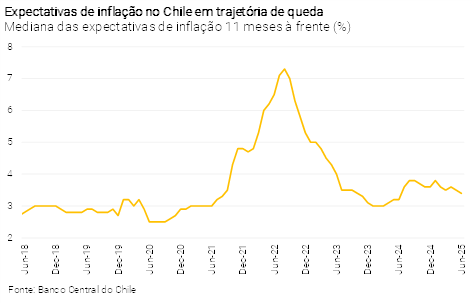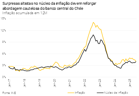 Diante desse cenário, o banco central (BCCh) manteve a taxa de juros em 5,0% na reunião de junho, mas sinalizou cortes graduais ao longo dos próximos trimestres. Esperamos que o BCCh retome o ciclo de cortes de juros com uma redução de 0,25 p.p. na reunião de julho. Ainda assim, a surpresa altista no núcleo da inflação, especialmente em serviços, justifica uma abordagem cautelosa por parte da autoridade. Esperamos a taxa básica de juros em 4,5% no final deste ano.