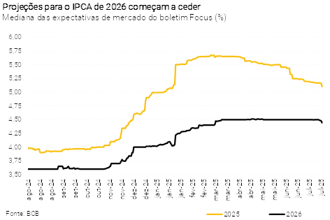 À medida que o cenário de real mais forte e IPCA mais baixo se materialize, as expectativas de inflação para 2026 devem começar a ceder – como já ocorre para 2025. Assim, o BCB deve gradualmente ganhar confiança de que o esforço da política monetária está surtindo efeito.
