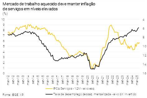 Nos preços, a inflação de curto prazo mostrou alívioconcentrado nos alimentos e bens industrializados. A inflação ao atacado (IPA) acumulou deflação de 3% nos últimos seis meses. Assim, o cenário prospectivo de preços ao consumidor ficou mais benigno do que projetávamos. Considerando a taxa de câmbio mais apreciada, projetamos preços menos pressionados para bens industrializados no segundo semestre, especialmente em bens duráveis.Por outro lado, apesar do alívio recente, os fundamentos para a inflação de serviços – emprego, renda, expectativas – não sugerem uma queda persistente e disseminada à frente. Diante desse cenário, projetamos a inflação de 2025 em 5,0%.