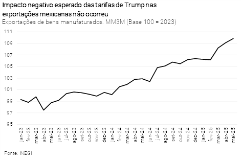 No cenário externo, aumentou a pressão dos Estados Unidos sobre o México para combater o tráfico de fentanil. Em junho, autoridades americanas sancionaram três instituições financeiras mexicanas por suspeita de lavagem de dinheiro associada a cartéis, gerando riscos sistêmicos temporários no mercado local. Após negociações, o governo dos Estados Unidos concedeu prazo de 45 dias para adequações, e os riscos foram contidos. Além disso, Trump ameaçou impor tarifas de 30% às exportações mexicanas a partir de agosto, o que adiciona incerteza às discussões comerciais.