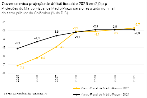 O Marco Fiscal de Médio Prazo – documento divulgado anualmente pelo governo com as projeções de receitas, despesas e metas fiscais para os próximos anos –confirmou a deterioração das contas públicas. A cláusula de escape da regra fiscal foi acionada por três anos. As metas de superávit primário a partir de 2028 parecem pouco realistas, o que aumenta o risco de revisão da própria regra fiscal. Nesse contexto, duas agências rebaixaram a nota de crédito soberano da Colômbia. A Moody’s reduziu o rating para Baa3, com perspectiva estável, e a S&P rebaixou para BB, com perspectiva negativa. A Fitch deve seguir na mesma direção. O risco fiscal elevado já era precificado pelos mercados, mas o movimento reforça a percepção de fragilidade institucional no cumprimento da âncora fiscal.
