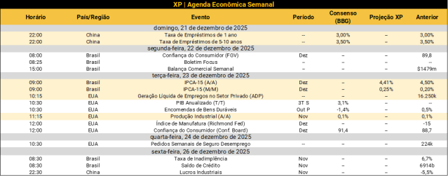No cenário internacional, a agenda dos Estados Unidos contará com a publicação da geração de empregos no setor privado (relatório ADP) de novembro e a segunda leitura do PIB do 3T25. Na China, o banco central (PBoC) deve manter as taxas de empréstimos de curto prazo (1 ano) e médio prazo (5-10 anos) em 3,00% e 3,50%, respectivamente.