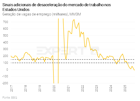 O mercado de trabalho americano apresentou sinais adicionais de desaceleração. Em outubro, houve destruição líquida de 105 mil vagas, resultado bem pior que a expectativa de mercado (-25 mil), influenciado pela redução de 162 mil postos no governo federal devido a um programa de demissão voluntária. Em novembro, porém, foram criadas 64 mil ocupações, ligeiramente acima do consenso de 50 mil. A taxa de desemprego avançou de 4,4% em setembro para 4,6% em novembro (previsão: 4,5%), enquanto a taxa de participação subiu de 62,4% para 62,5%. O crescimento salarial foi moderado, com alta de apenas 0,1% no mês (vs. 0,3% esperado) e 3,5% em relação ao ano anterior (vs. 3,6%).