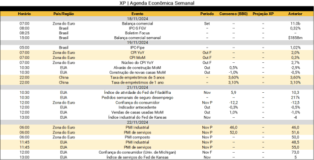 No Brasil, a agenda da próxima semana será esvaziada, sem indicadores relevantes no radar. O mercado aguardará possíveis detalhamentos sobre o pacote de contenção de despesas em discussão pelo governo. Segundo a imprensa, novidades deverão ser anunciadas após a cúpula do G20 no Rio de Janeiro.