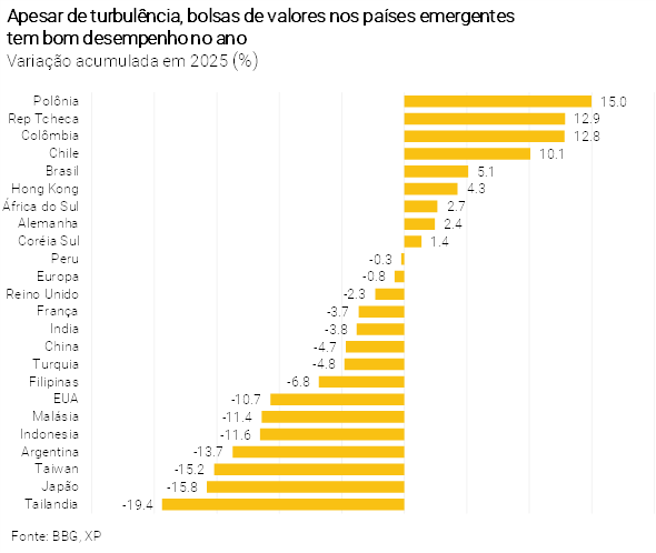 O aumento das tensões comerciais entre as duas principais potências geopolíticas trouxe fortes oscilações nos mercados financeiros globais. A probabilidade de recessão nos Estados Unidos aumentou. As bolsas fecharam em queda nesta semana e o dólar americano desvaloriza frente às incertezas. Nos países emergentes, as bolsas de valores parecem operar na contramão, com desempenho positivo no ano.