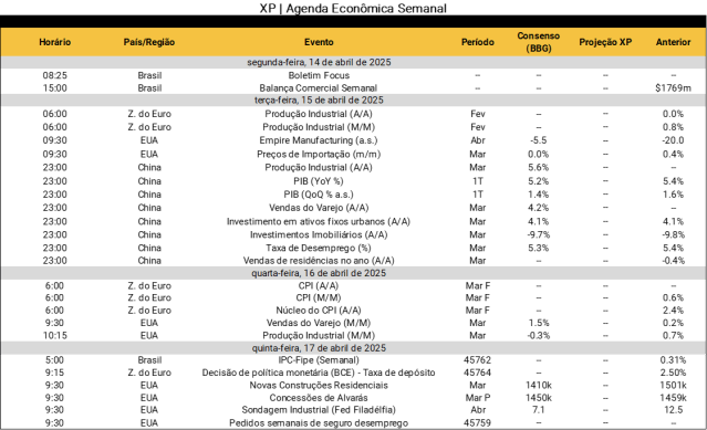 No cenário internacional, o destaque será o desenrolar da guerra comercial entre Estados Unidos e China. Na agenda, o Banco Central Europeu se reunirá para definir a taxa básica de juros da região – o mercado projeta que a autoridade monetária persista no ciclo de cortes de juros, com redução de 0,25 p.p., para fazer frente à desaceleração econômica do bloco. Na China, haverá a divulgação do PIB do 1T25, além de estatísticas de emprego e atividade. Nos Estados Unidos, o mercado se atentará para as vendas varejistas e a produção industrial, ambas referentes a março.