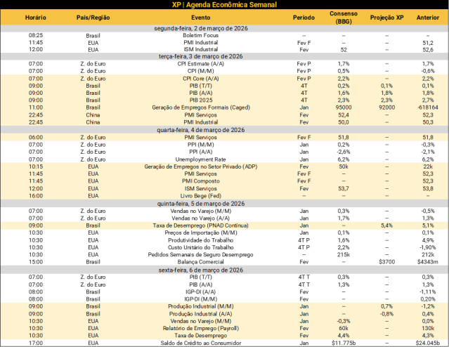 No Brasil, o destaque será a divulgação do PIB do 4º trimestre e, consequentemente, de 2025 pelo IBGE. Projetamos que a economia brasileira tenha crescido 0,1% entre o 3º e o 4º trimestre, resultando em um PIB de 2,3% em 2025. Além disso, estão na agenda as estatísticas de emprego (trazidas pelo Caged e a PNAD Contínua), além da produção industrial de janeiro e a balança comercial de fevereiro. Veja nossas projeções abaixo.