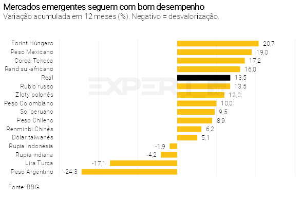 Outros ativos também se beneficiam desse cenário. O Ibovespa, em patamar recorde, acumula alta de 19% no ano. A título de comparação, o índice mexicano sobe 11%, enquanto na Colômbia, a valorização é de 15,70%.