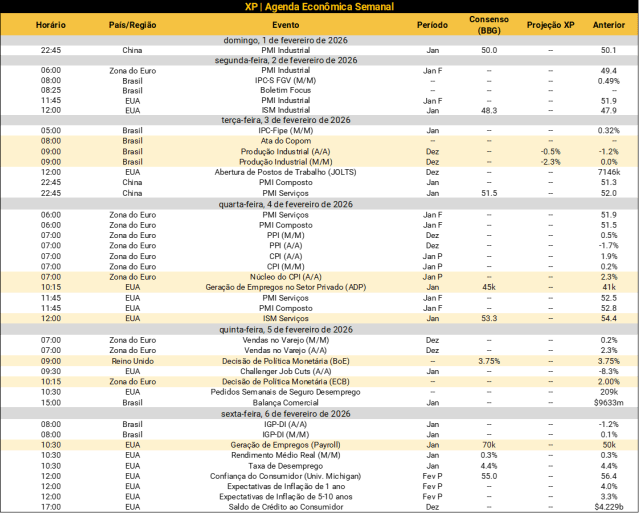 No cenário internacional, destaque para indicadores de mercado de trabalho de janeiro nos Estados Unidos, especialmente para o Nonfarm Payroll na 6ª-feira. Na Zona do Euro e no Reino Unido, haverá decisões de política monetária – para ambas as regiões, o mercado espera manutenção nas taxas básicas de juros. Por fim, índices PMIs serão divulgados em todas as principais economias – lembrando que PMIs são sondagens empresariais que visam aferir o pulso da atividade econômica.