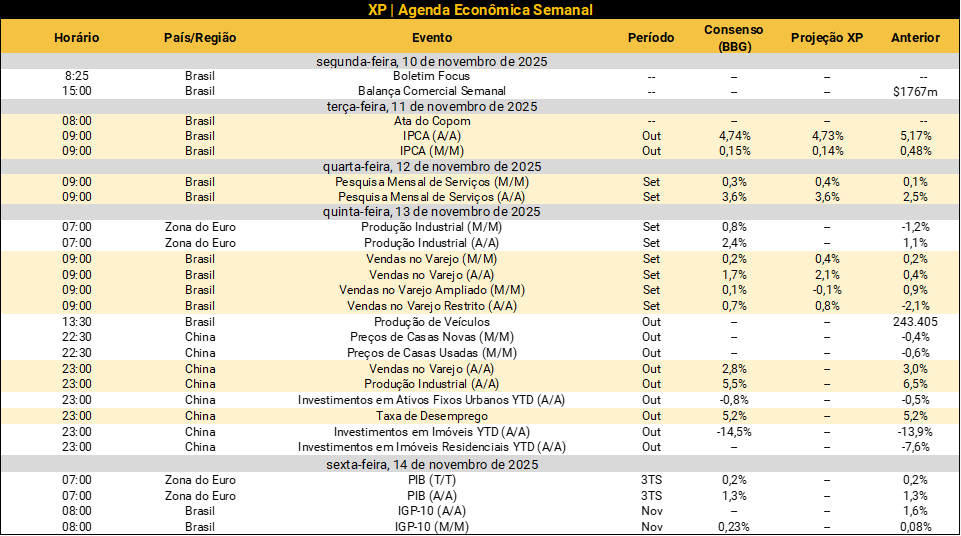 No Brasil, o destaque será a divulgação da ata do Copom na terça-feira, que trará um detalhamento sobre a reunião em que decidiu pela manutenção da taxa Selic em 15,00%. No mesmo dia, o IBGE divulgará o IPCA de outubro, que deve trazer sinais adicionais de alívio. Em relação à atividade econômica, destaque para a publicação das receitas do setor de serviços e vendas no varejo, ambas referentes a setembro. Veja as nossas projeções abaixo.