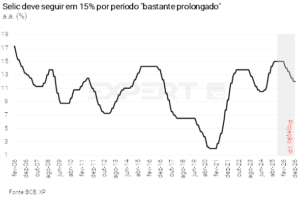 Veja na seção “Copom mantém a taxa Selic em 15,00% e reforça postura cautelosa“
