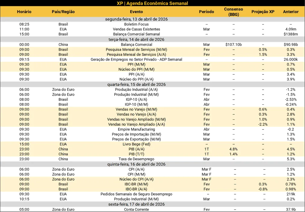 No cenário internacional, destaque para a publicação de dados de atividade na China. Entre eles, produção industrial, vendas varejistas, investimentos em ativos fixos e taxa de desemprego referentes a março, além do PIB do 1º trimestre de 2026. Além disso, índices de inflação ao consumidor da Zona do Euro e inflação ao produtor dos Estados Unidos serão conhecidos na semana que vem.