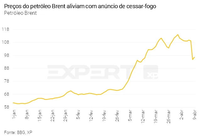 Estados Unidos e Irã anunciaram um cessar‑fogo após quase seis semanas de conflito. A decisão abriu espaço para negociações de paz, previstas para ocorrer nos próximos dias. Porém, o acordo permanece frágil e o tráfego no Estreito de Ormuz tem restrições. Os preços do petróleo caíram em cerca de 15% nesta semana, mas continuam em níveis bastante altos.