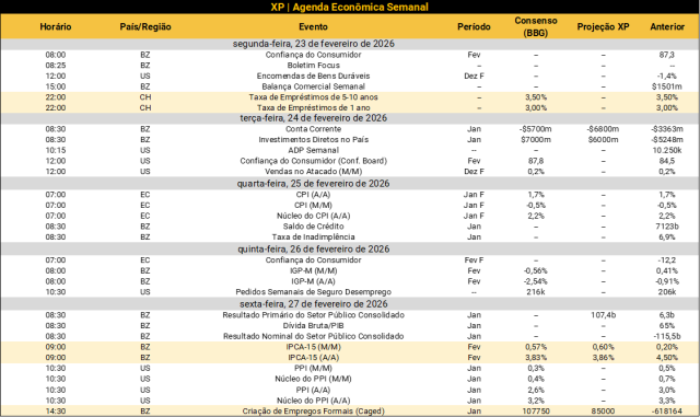 No Brasil, o protagonismo da próxima semana ficará com o IPCA-15 de fevereiro, para o qual esperamos aceleração ante janeiro, especialmente por reajustes em educação. Do lado da atividade econômica, o Ministério do Trabalho trará a geração de emprego formal (relatório Caged) de janeiro. Além disso, o banco central divulgará as estatísticas de crédito, fiscais e do setor externo – também de janeiro. Veja nossas projeções abaixo.