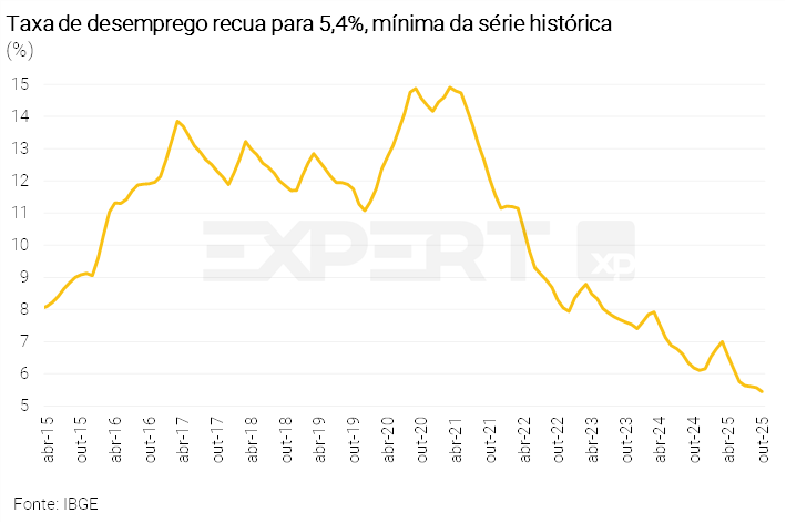 Esse quadro reforça as apostas de que o Fed, banco central, seguirá com o ciclo de cortes de juros em dezembro, apesar de alguma pressão inflacionária. O mercado atribui probabilidade de cerca de 80% de um corte de 0,25 p.p. na taxa básica de juros na próxima reunião.