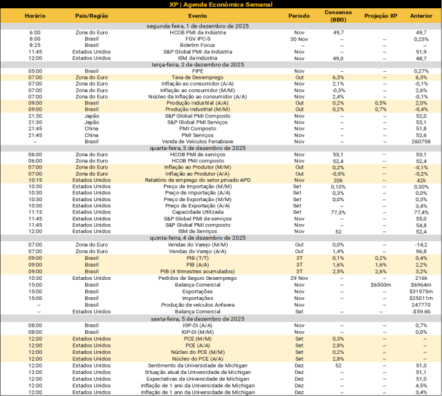 No Brasil, destaque para a divulgação do PIB do 3º trimestre. Esperamos que a economia mostre sinais de arrefecimento, com crescimento de 0,2% contra o 2° trimestre após alta de 0,4% no trimestre anterior. Serviços seguem como destaque, enquanto indústria avança pouco e agro recua com o fim da safra. Para 2025, projetamos crescimento de 2,1%, sustentado por mercado de trabalho forte e estímulos fiscais. Por fim, temos a produção industrial, que deve avançar 0,2% em outubro. Veja as nossas projeções abaixo.