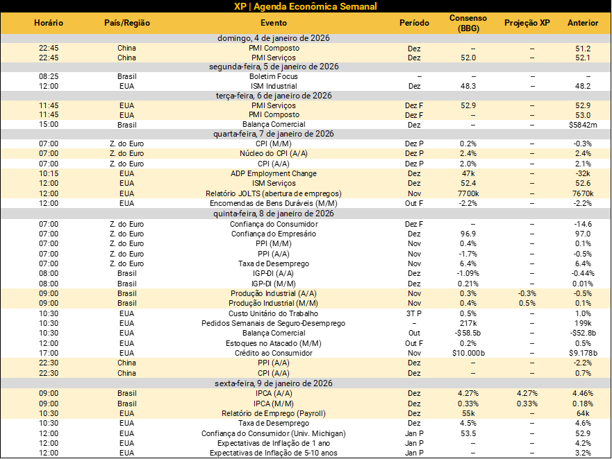 No cenário internacional, a agenda dos Estados Unidos trará os principais indicadores de mercado de trabalho de dezembro, com ênfase ao Payroll e à taxa de desemprego. Na China, serão conhecidos os índices de inflação ao consumidor e ao produtor do último mês. Na Zona do Euro, destaque para a leitura preliminar do CPI de dezembro. Por fim, índices PMI de serviços das principais economias serão publicados ao longo da semana – PMIs são sondagens empresariais que buscam captar o pulso da atividade econômica.
