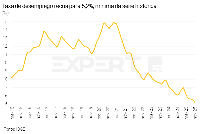 O mercado de trabalho continua aquecido. O CAGED (Cadastro Geral de Empregados e Desempregados) mostrou criação líquida de 85,9 mil empregos formais em novembro, acima das expectativas. Os dados do CAGED respaldam o cenário de desaceleração gradual da atividade doméstica. Na média, o saldo de emprego mensal recuou de 140 mil no primeiro semestre para 85 mil no segundo semestre de 2025.