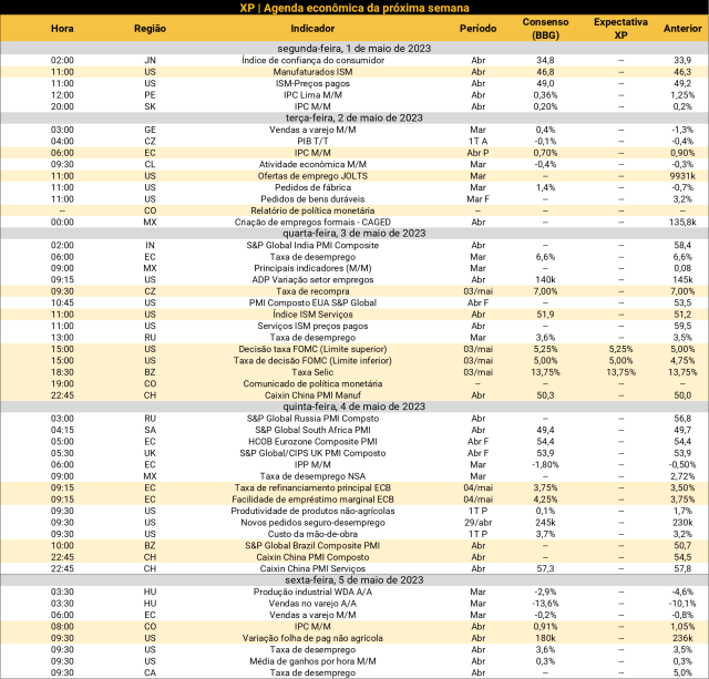 No Brasil, após o feriado de segunda-feira, será divulgada a balança comercial de abril, divulgada pelo Ministério da Economia. Na sexta, será publicado o nosso relatório Macro Mensal de maio.