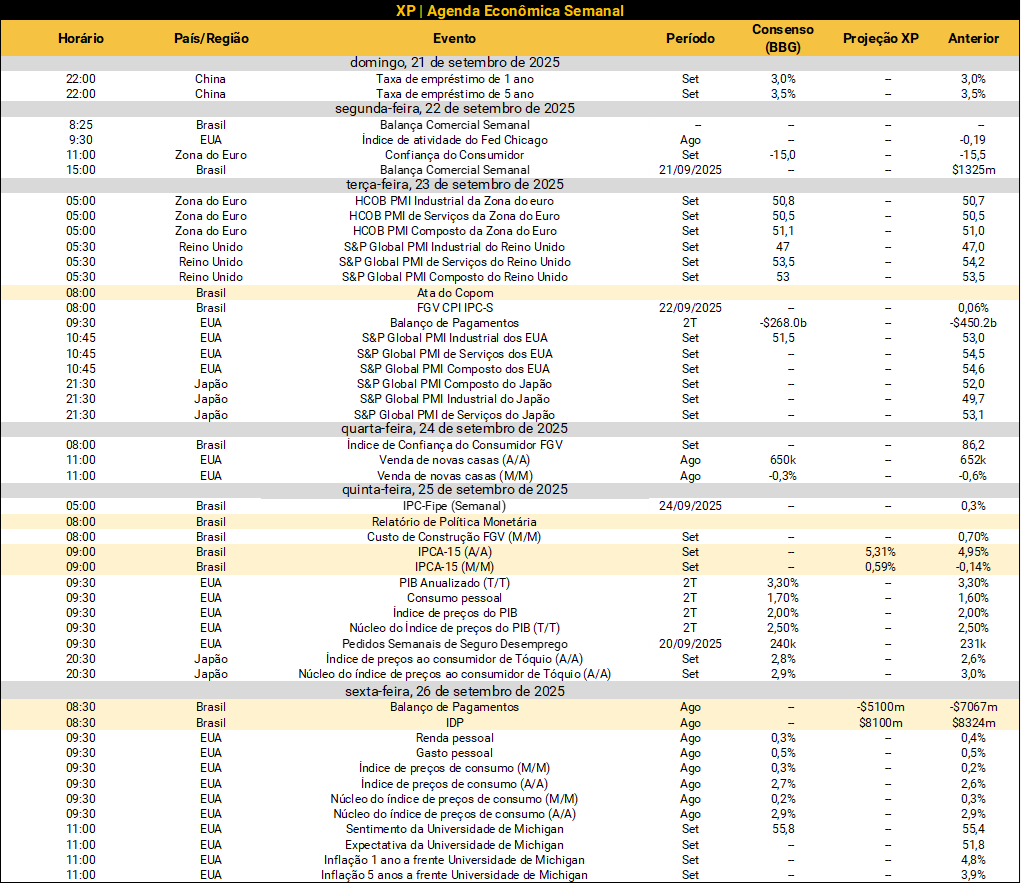 Na agenda internacional, destaque para a inflação ao consumidor de agosto nos Estados Unidos medida pelo PCE – é o indicador de inflação preferido do Fed, banco central. Ainda nos Estados Unidos, conheceremos os dados revisados do PIB do 2º trimestre e a confiança do consumidor de setembro. Na China, teremos decisão da taxa de juros de 1 e 5 anos pelo banco central. Ademais, leituras de PMIs na Zona do Euro e nos Estados Unidos serão divulgadas – o PMI é uma sondagem com gerentes de compras que visa medir o ritmo da atividade econômica. Por fim, vários diretores do Fed discursarão ao longo da semana.