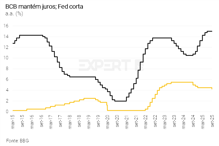 O Fed (banco central dos Estados Unidos) cortou sua taxa básica de juros em 0,25 p.p., para o intervalo entre 4,00% e 4,25%. A votação não foi unânime, já que Stephen Miran optou por uma redução de 0,50 p.p.. Segundo o comunicado, a autoridade monetária considera que “os riscos baixistas para o emprego aumentaram”. A nosso ver, o Fed está mais preocupado com o mercado de trabalho em comparação à dinâmica da inflação. Com relação ao cenário econômico dos membros do Fed, a mediana de projeções para a taxa de juros de referência sugeriu corte de 0,25 p.p. nas duas últimas reuniões deste ano e apenas um corte de 0,25 p.p. no ano que vem. No entanto, na coletiva de imprensa pós-reunião, a fala do presidente da autoridade, Jerome Powell, foi interpretada como mais dura do que o comunicado e as projeções econômicas. Powell, afirmou que as decisões de política monetária serão tomadas “reunião por reunião” e classificou o corte de juros como uma “gestão de risco”, afirmando não ser óbvio o que o banco central tem que fazer adiante.