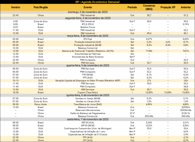No cenário internacional, a agenda econômica americana segue com poucas divulgações, ainda refletindo os efeitos do shutdown. Destaque, porém, para divulgações do mercado de trabalho, notadamente o relatório JOLTS de aberturas de postos de trabalho e o ADP, que traz a geração líquida de empregos no setor privado. Além disso, índices PMIs das principais economias serão divulgados ao longo da semana – trata-se de sondagens com empresas que visam medir o pulso da atividade econômica. Na China, os indicadores de inflação ao produtor e consumidor serão conhecidos. Por fim, no Reino Unido, o Banco da Inglaterra deverá manter a taxa básica de juros em 4,00%.
