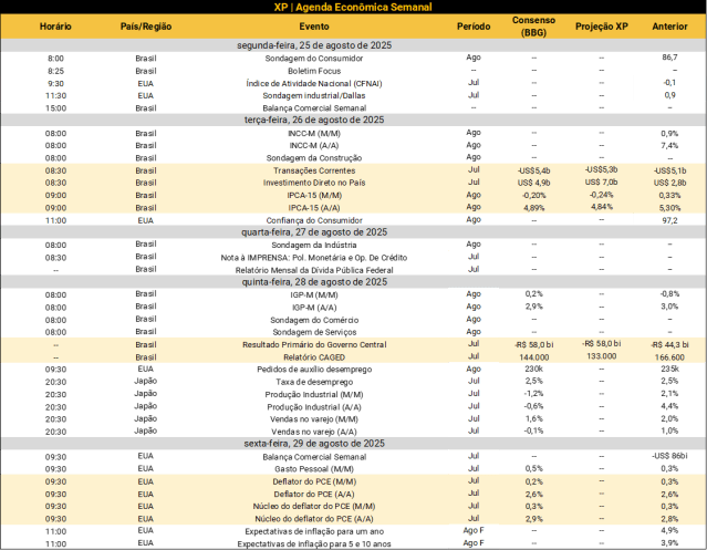 No cenário internacional, agenda de indicadores relativamente vazia. A principal divulgação será a inflação ao consumidor de julho, medida pelo deflator do PCE (despesas de consumo) nos Estados Unidos, o principal índice de inflação utilizado pelo Fed (banco central) em suas decisões de política monetária.